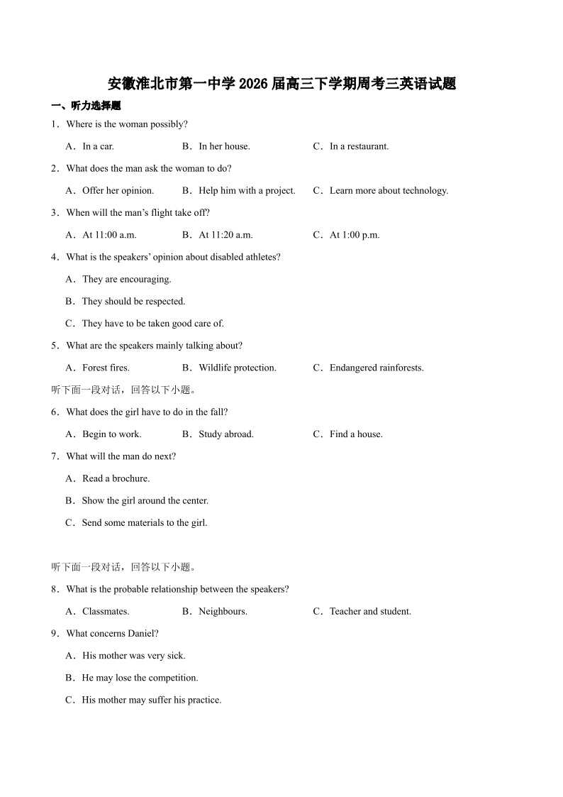 安徽省淮北市第一中学2026届高三下学期周考(三)英语试题(含答案).pdf
