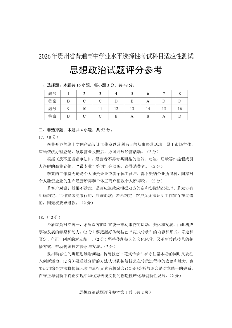 2026年贵州省普通高中学业水平选择性考试科目适应性测试 政治答案.pdf