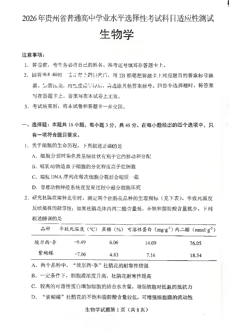 2026年贵州省普通高中学业水平选择性考试科目适应性测试 生物.pdf