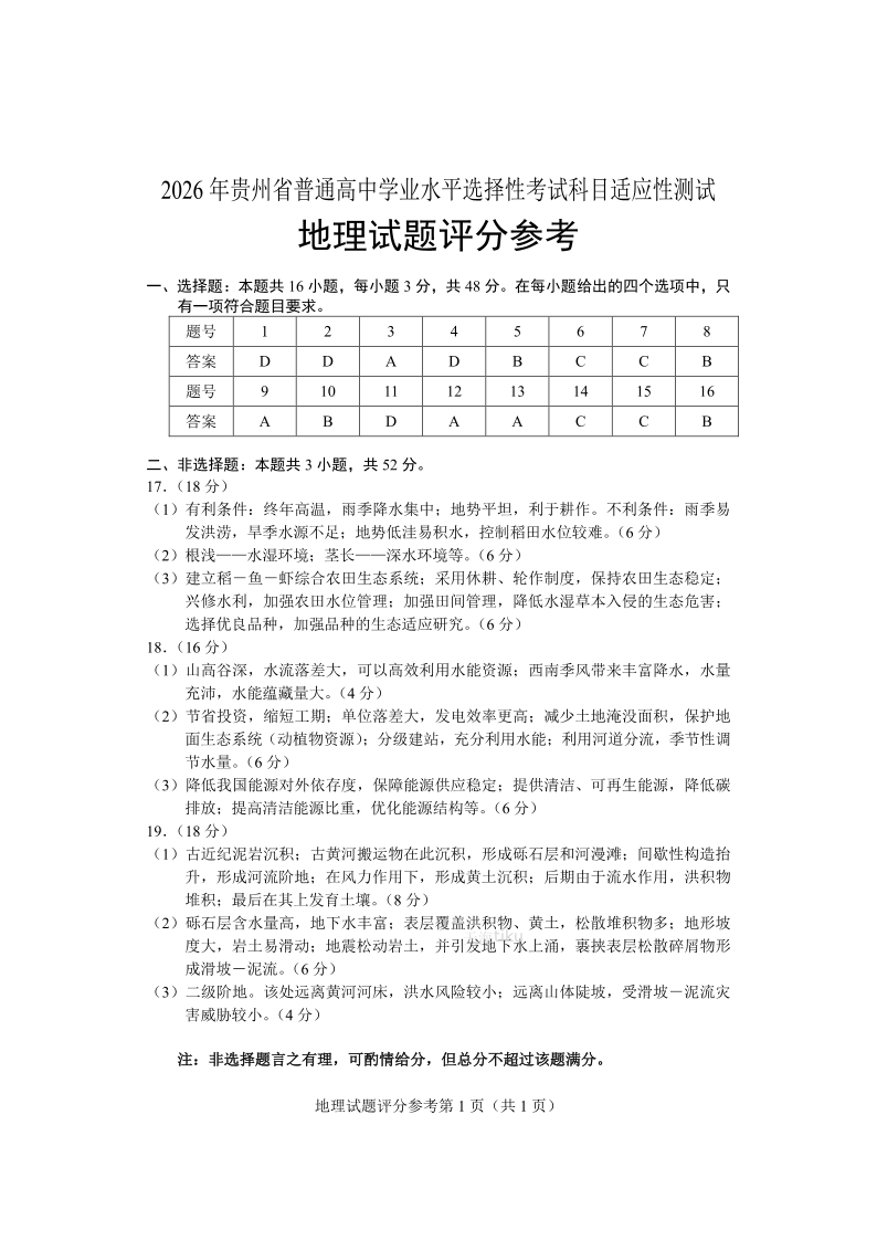 2026年贵州省普通高中学业水平选择性考试科目适应性测试 地理答案.pdf