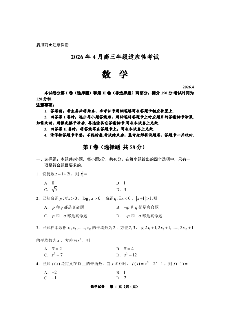 贵阳市2026年4月高三年级适应性考试 数学.pdf