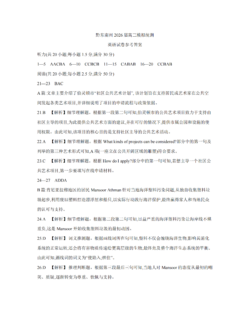 贵州省黔东南州2026届高三下学期模拟统测 英语答案.pdf