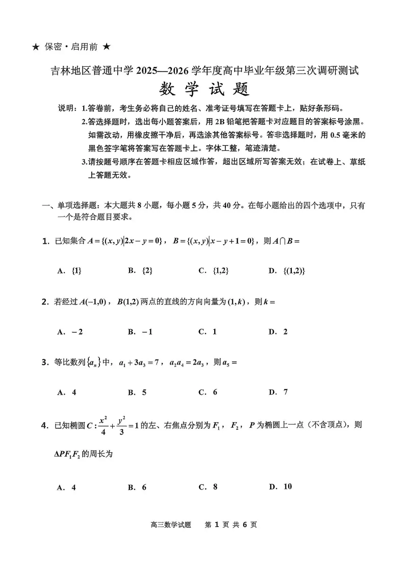 吉林地区普通中学2025-2026学年度高中毕业年级第三次调研测试 数学试题(含答案).pdf