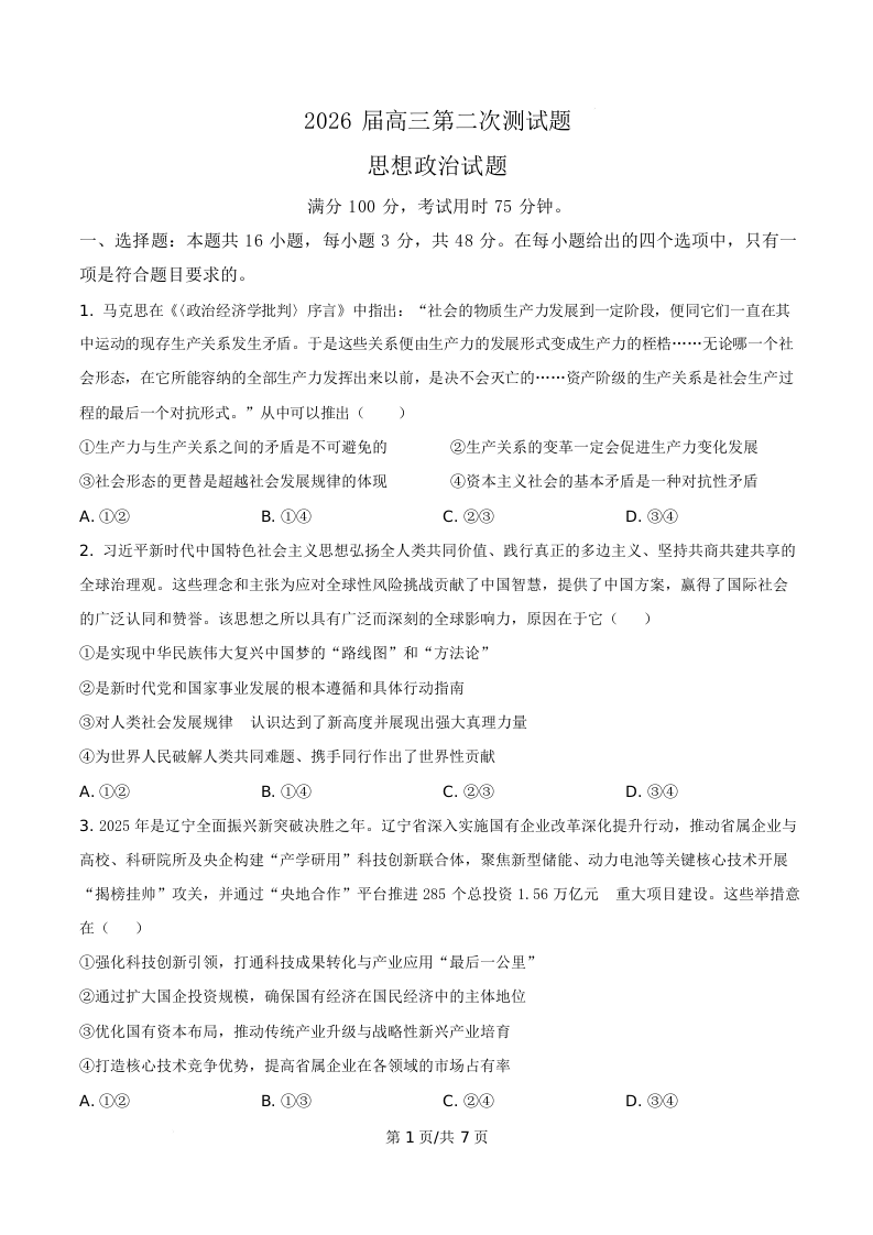 渤海大学附属高级中学2026届高三下学期第二次模拟预测 政治.docx