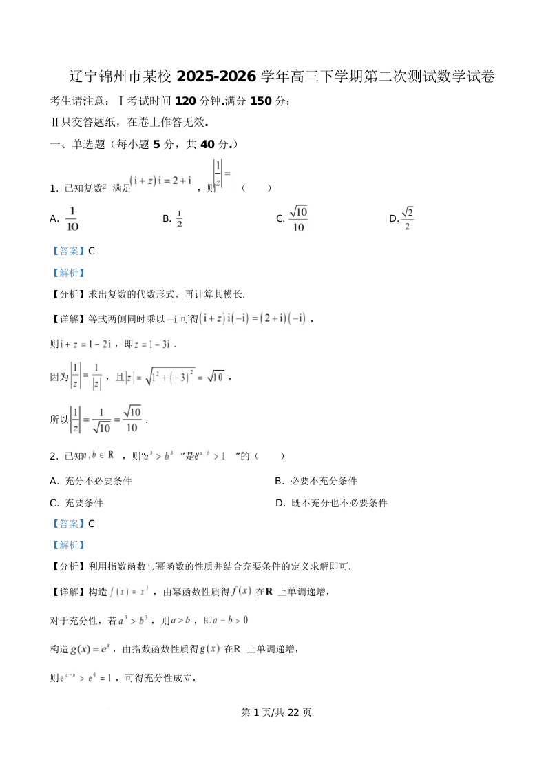 渤海大学附属高级中学2026届高三下学期第二次模拟预测 数学答案.docx