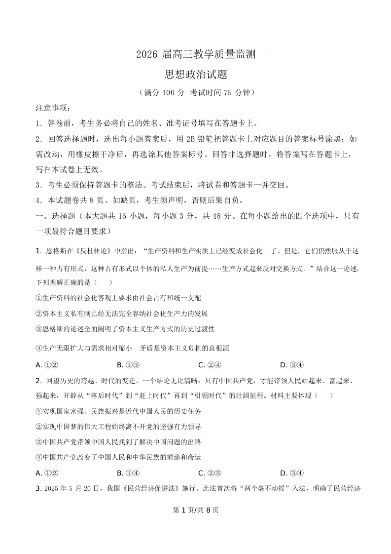 湖南省郴州市2026届高三下学期3月教学质量监测 政治.docx