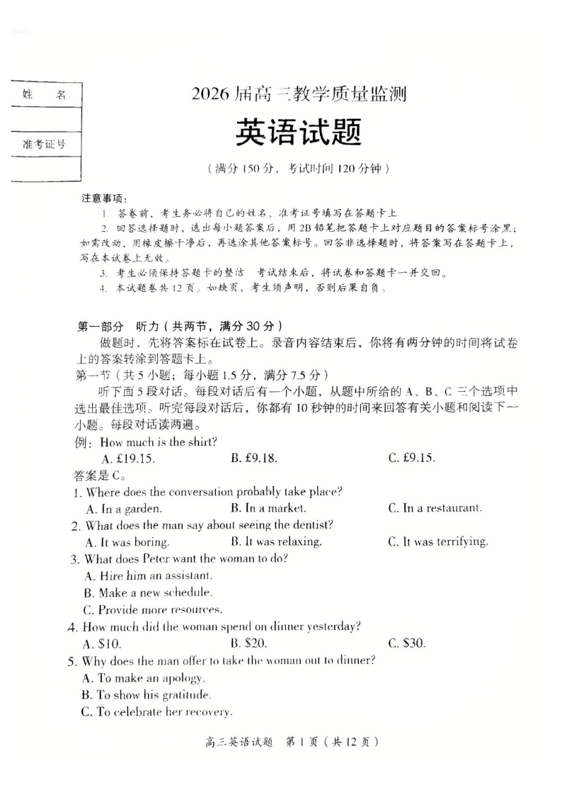 湖南省郴州市2026届高三下学期3月教学质量监测 英语.pdf