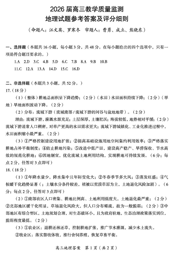湖南省郴州市2026届高三下学期3月教学质量监测 地理答案.pdf