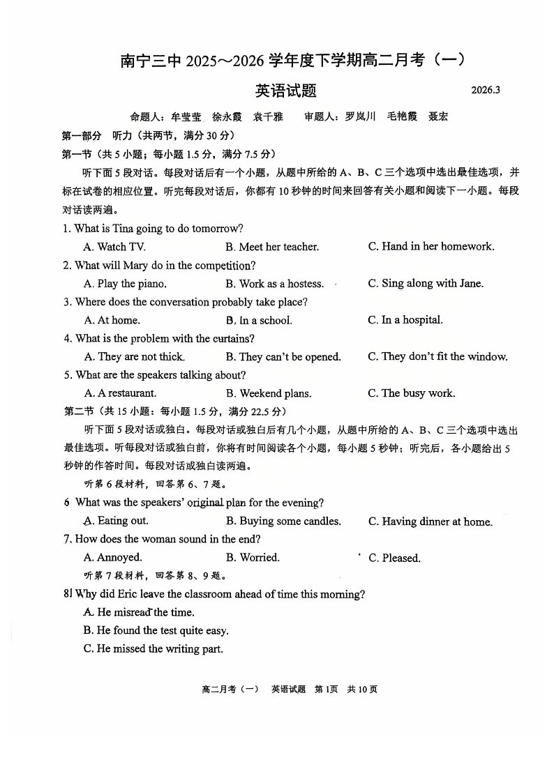南宁三中2025-2026学年度下学期高二年级月考(一)英语.pdf