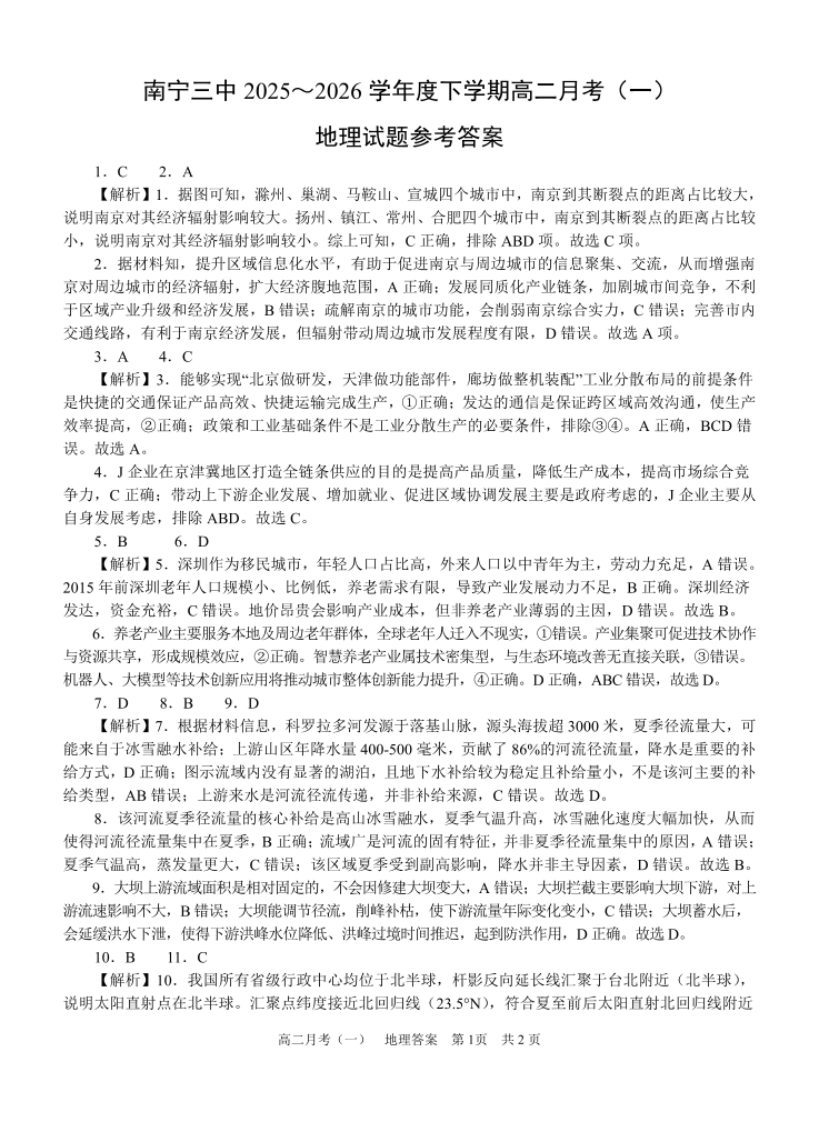 南宁三中2025-2026学年度下学期高二年级月考(一)地理答案.pdf
