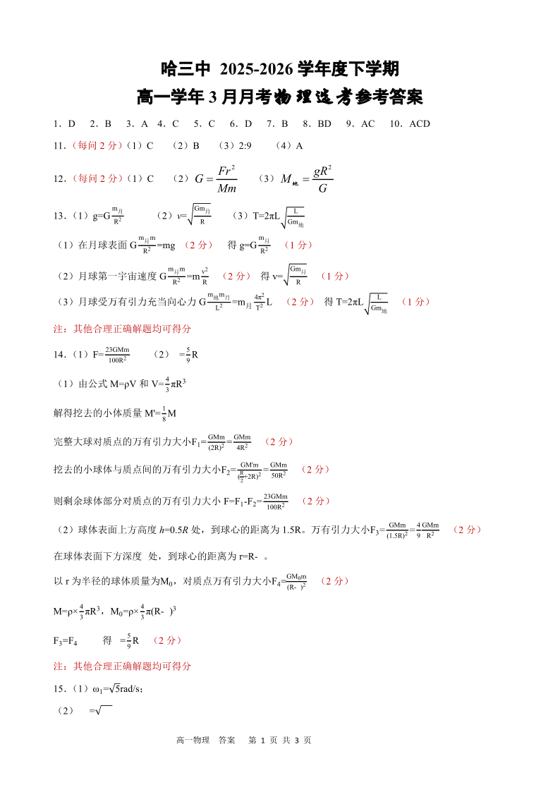 哈尔滨市第三中学2025-2026学年度下学期高一学年三月月考 物理答案.pdf