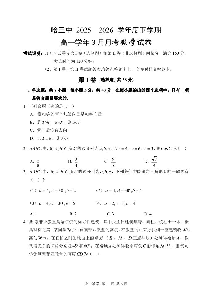 哈尔滨市第三中学2025-2026学年度下学期高一学年三月月考 数学.pdf