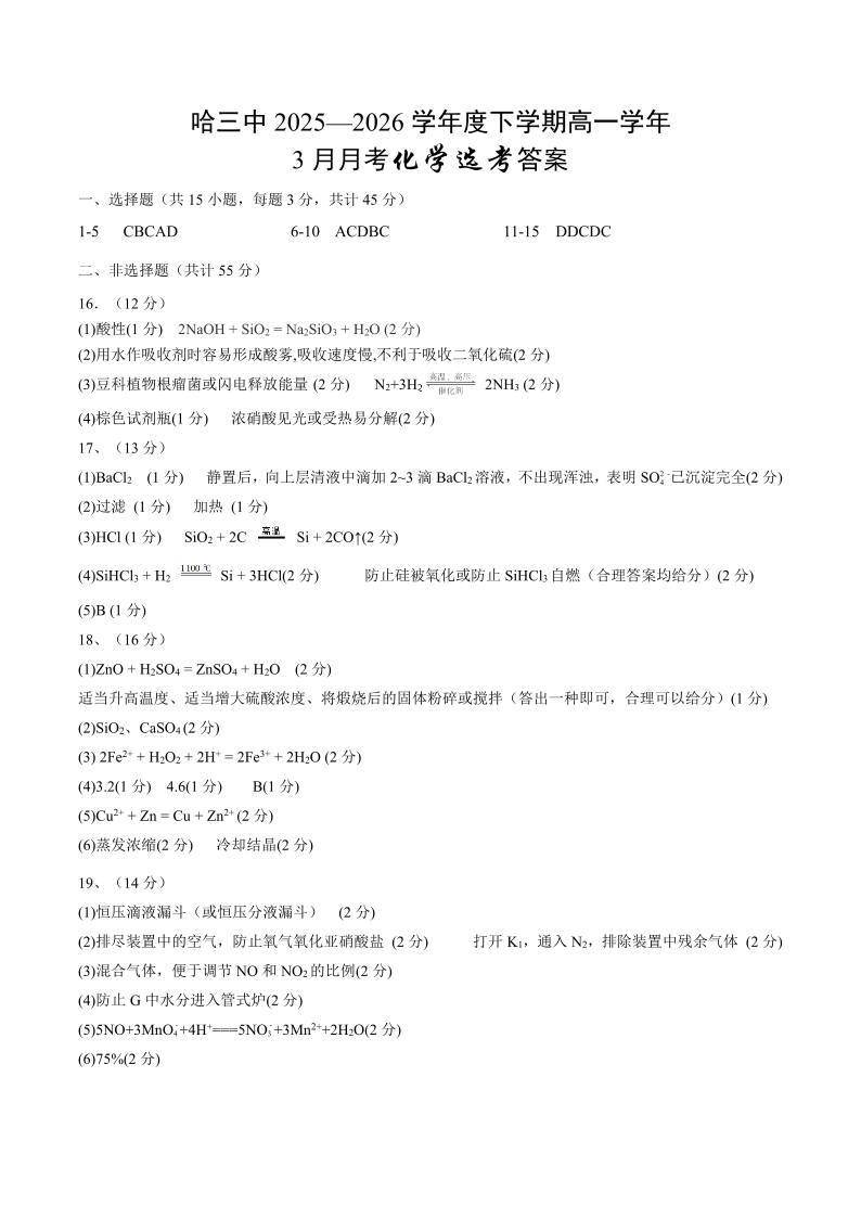 哈尔滨市第三中学2025-2026学年度下学期高一学年三月月考 化学答案.pdf