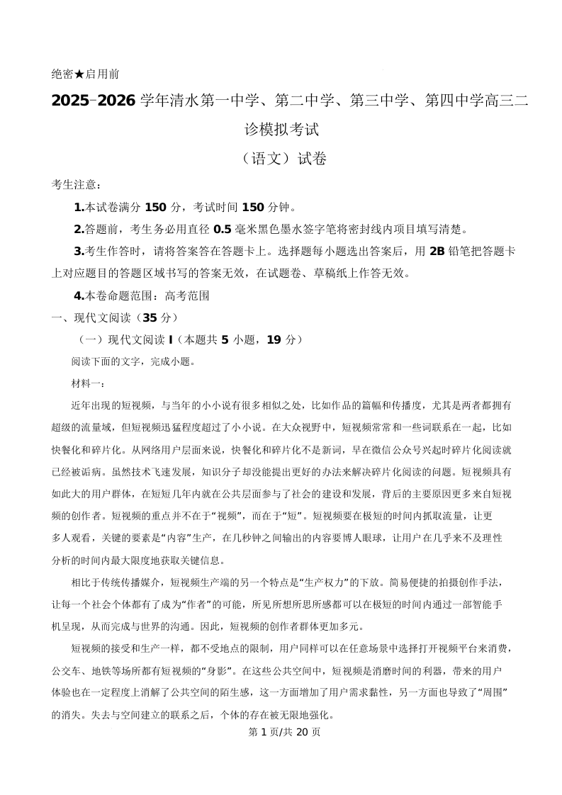 甘肃省天水市清水四校2026届高三下学期二诊模拟预测 语文答案.docx