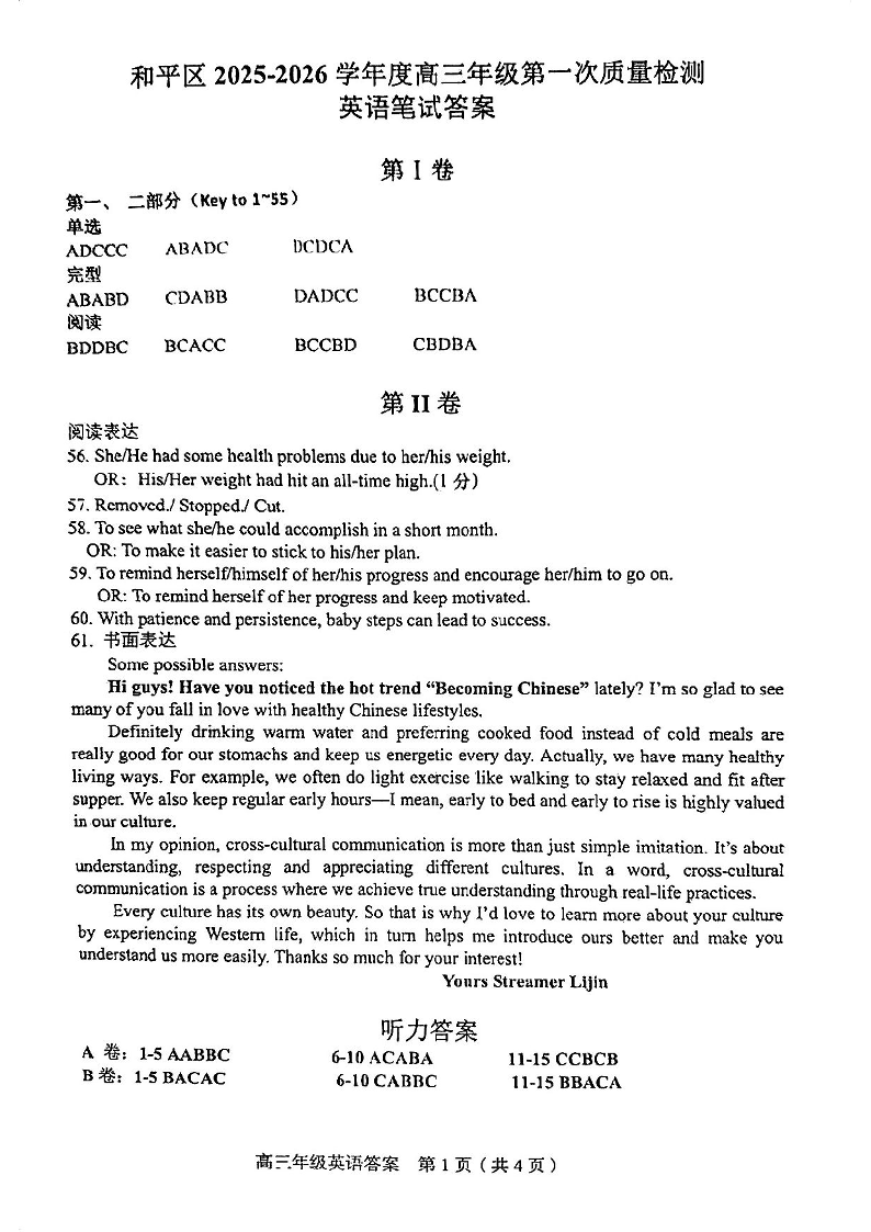 和平区2025-2026学年度高三年级第一次质量检测 英语答案.pdf