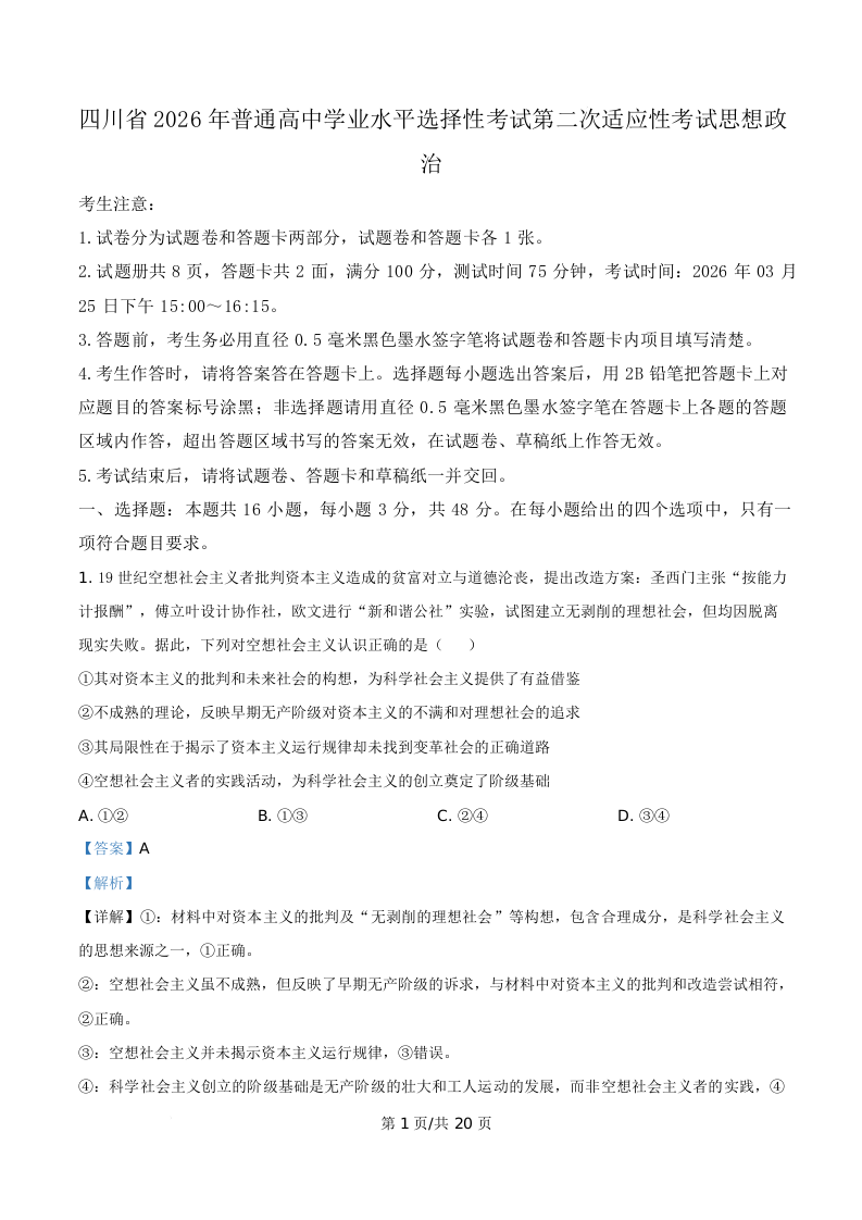 四川省字节精准教育联盟2026届高三下学期第二次适应性考试 政治答案.docx