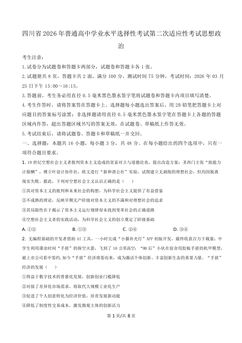 四川省字节精准教育联盟2026届高三下学期第二次适应性考试 政治.docx