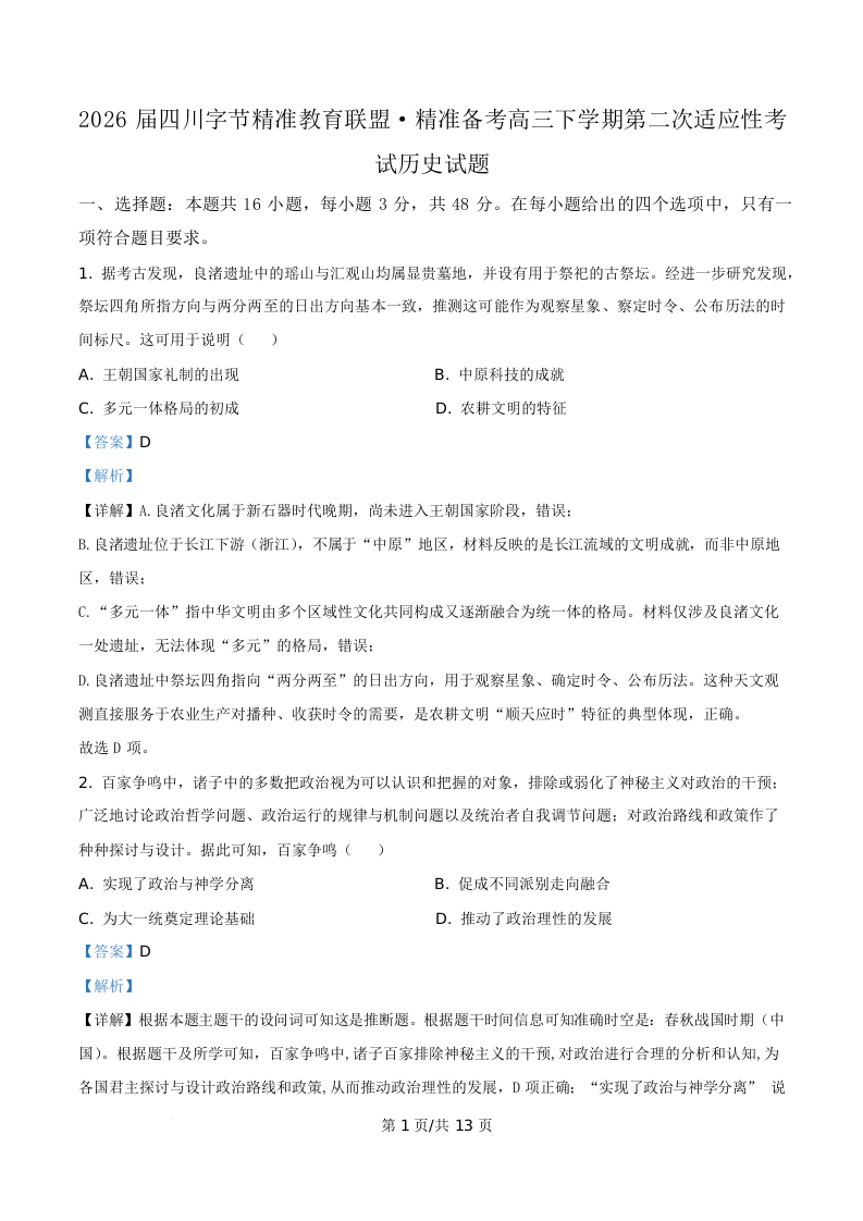 四川省字节精准教育联盟2026届高三下学期第二次适应性考试 历史答案.docx