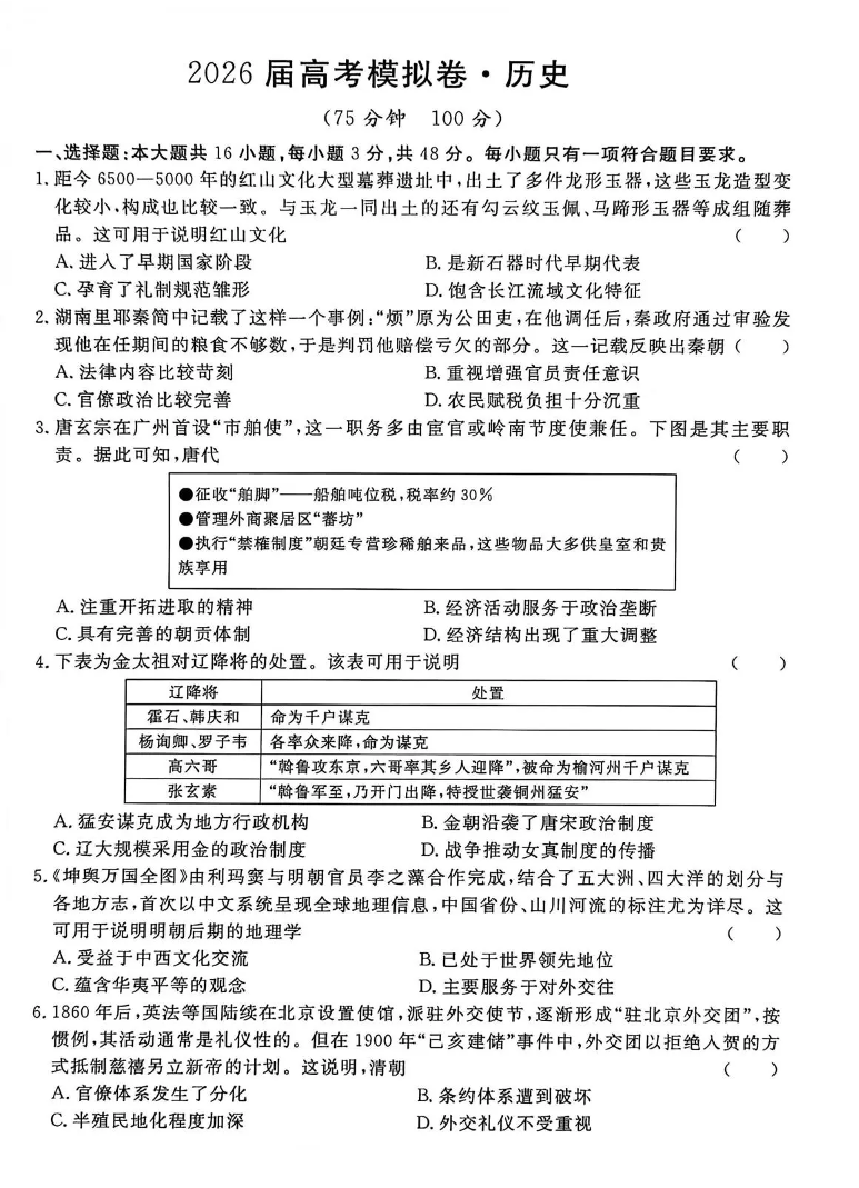 河北省沧州市五校2026届高考模拟卷 历史试题(含答案).pdf