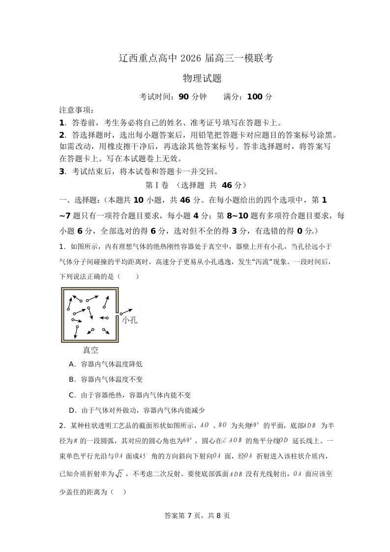 辽西重点高中2026届高三一模联考 物理.docx