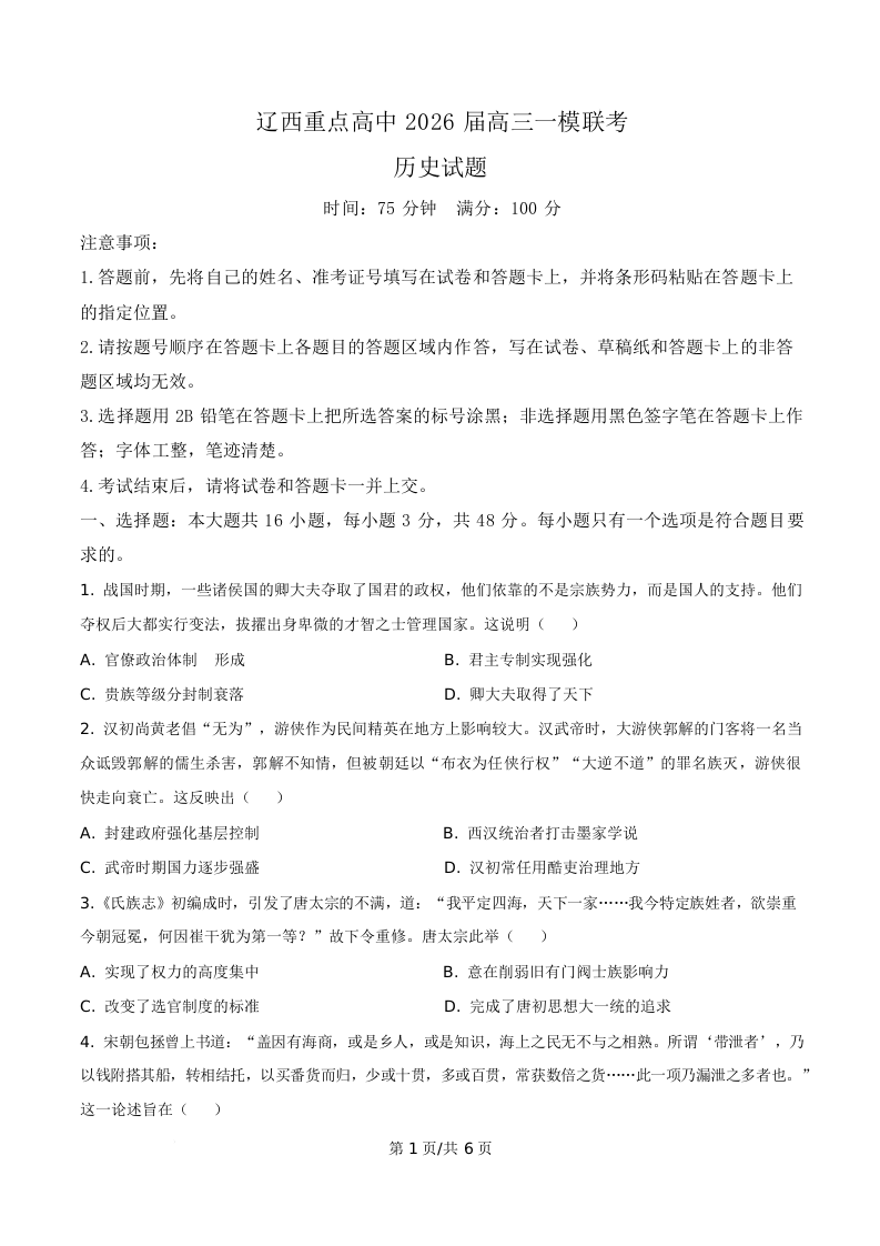 辽西重点高中2026届高三一模联考 历史.docx