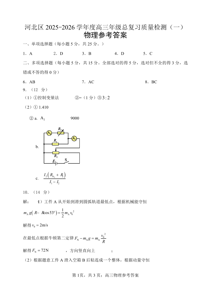 天津河北区2025-2026学年度高三年级总复习质量检测(一)物理答案.pdf