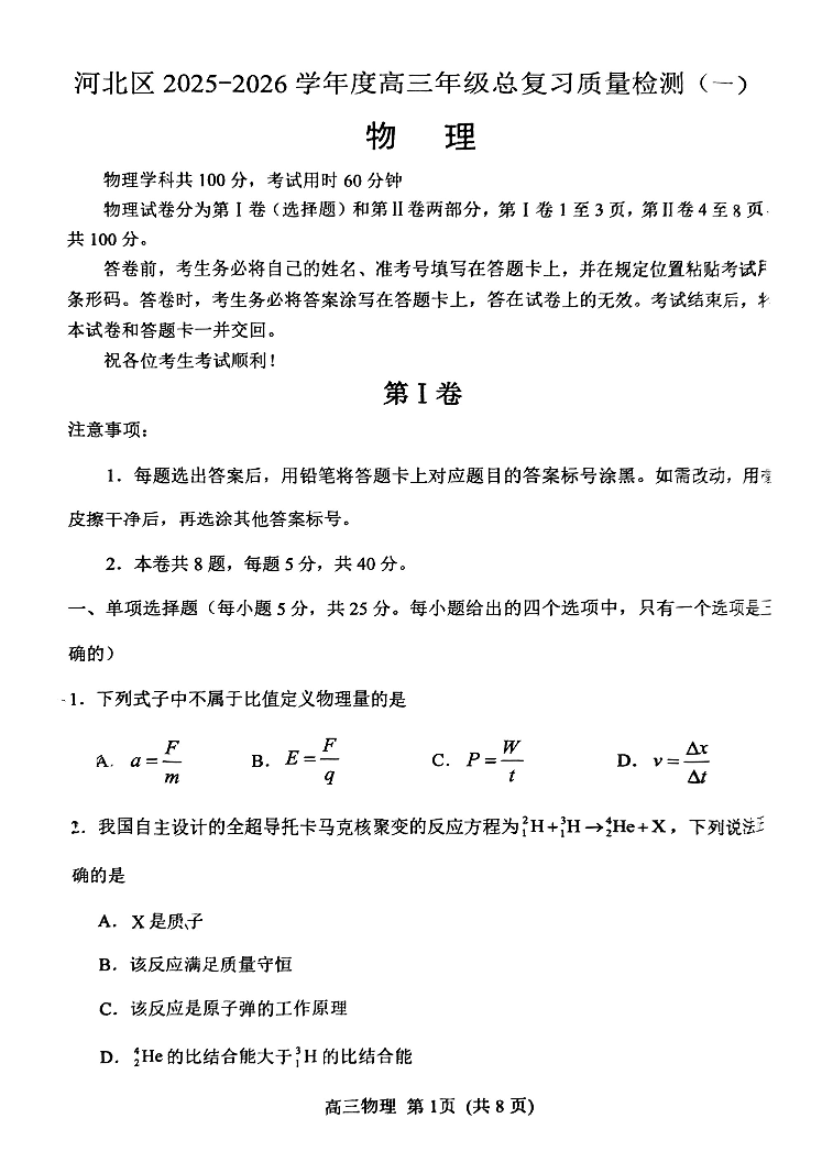 天津河北区2025-2026学年度高三年级总复习质量检测(一)物理.pdf