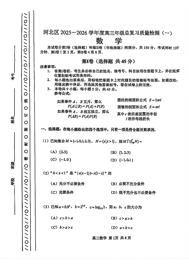 天津河北区2025-2026学年度高三年级总复习质量检测(一)数学.pdf