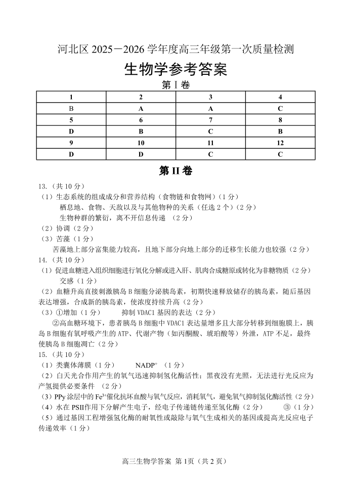 天津河北区2025-2026学年度高三年级总复习质量检测(一)生物答案.pdf
