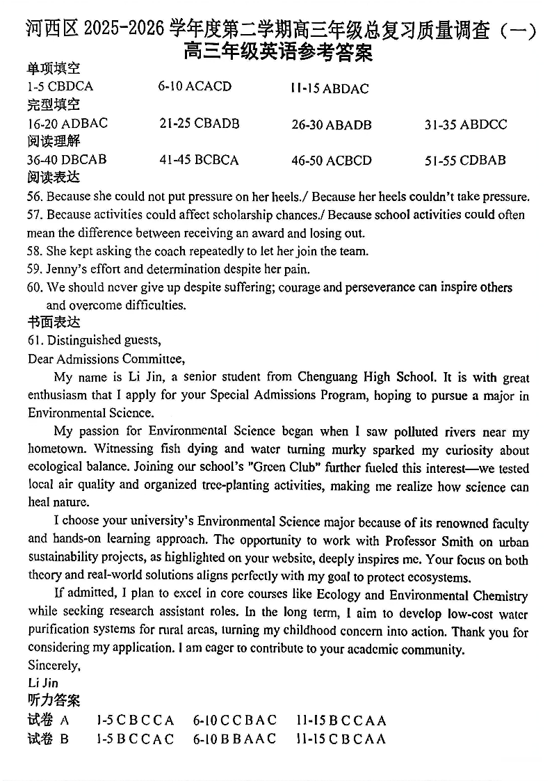 天津河西区2025-2026学年度第二学期高三年级总复习质量调查(一)英语答案.pdf