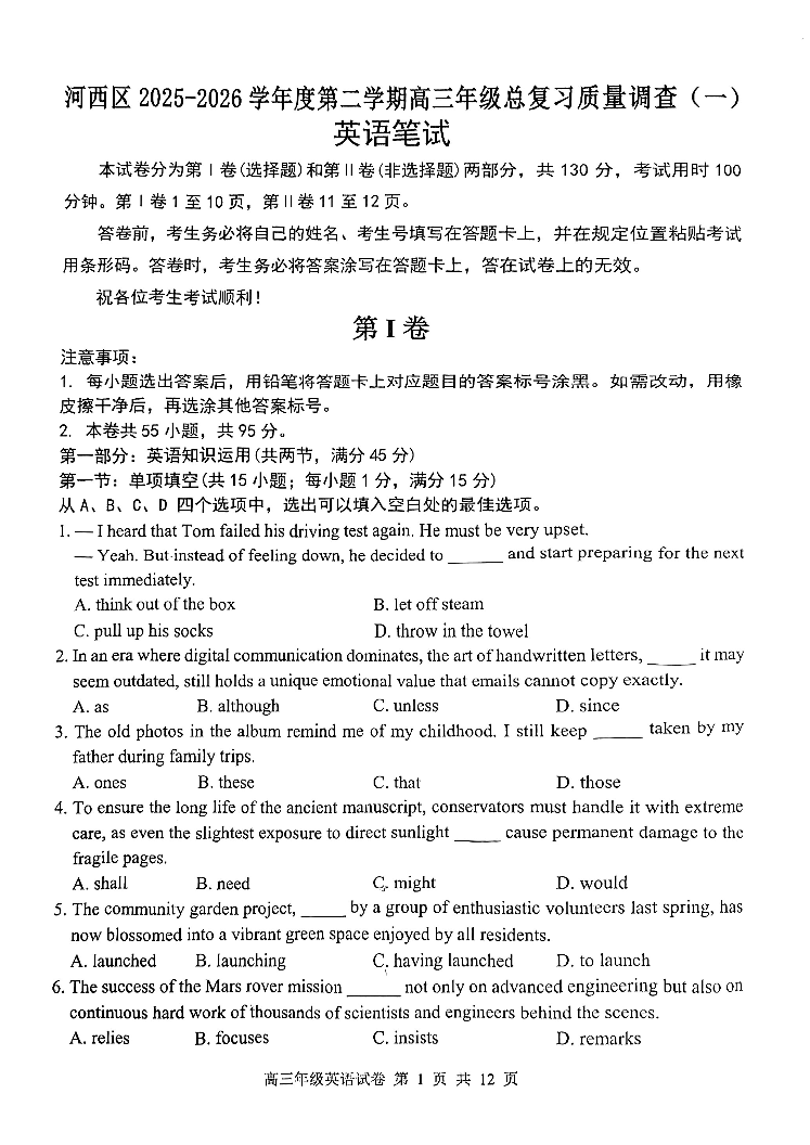 天津河西区2025-2026学年度第二学期高三年级总复习质量调查(一)英语.pdf