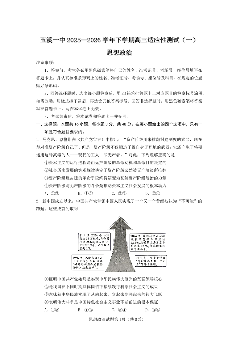 玉溪一中2025一2026学年下学期高三适应性测试(一)政治.pdf