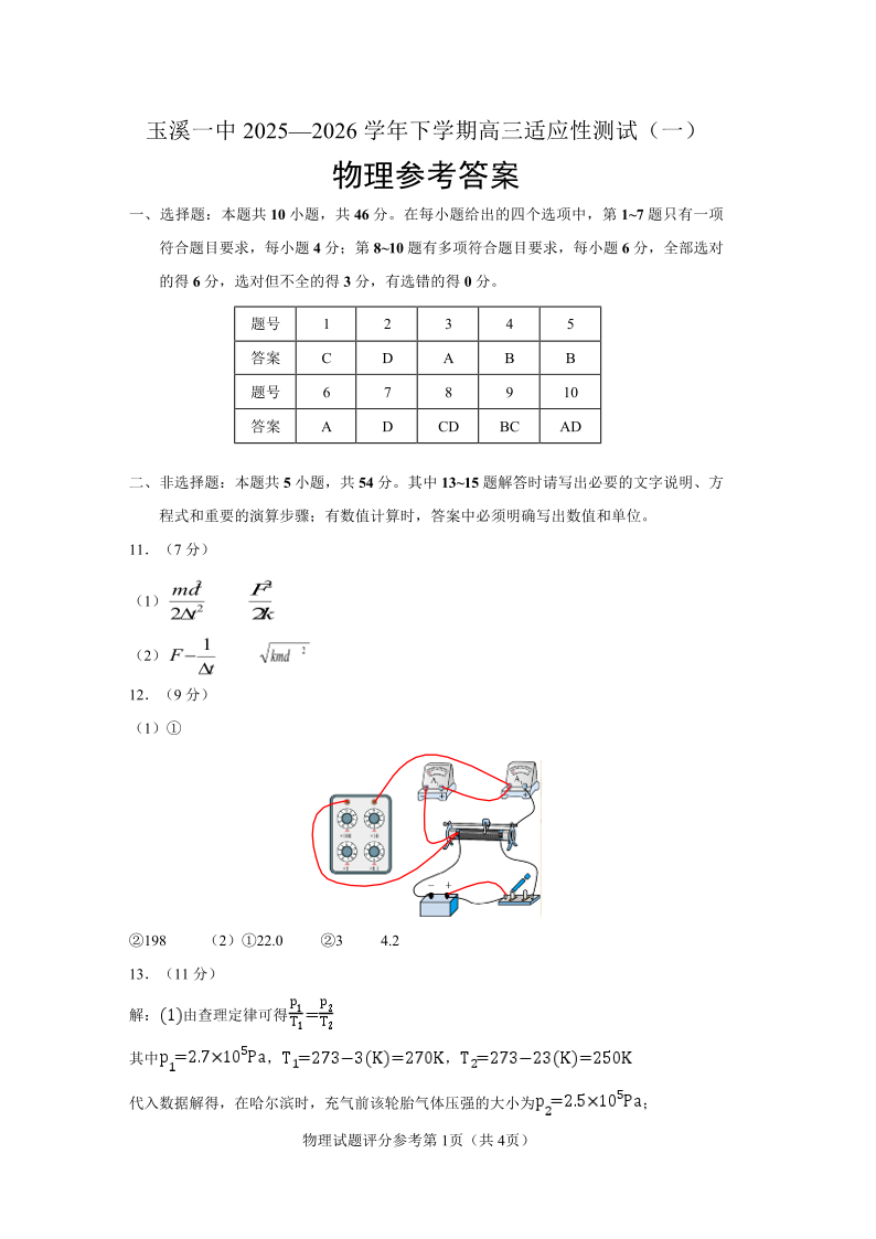 玉溪一中2025一2026学年下学期高三适应性测试(一)物理答案.pdf
