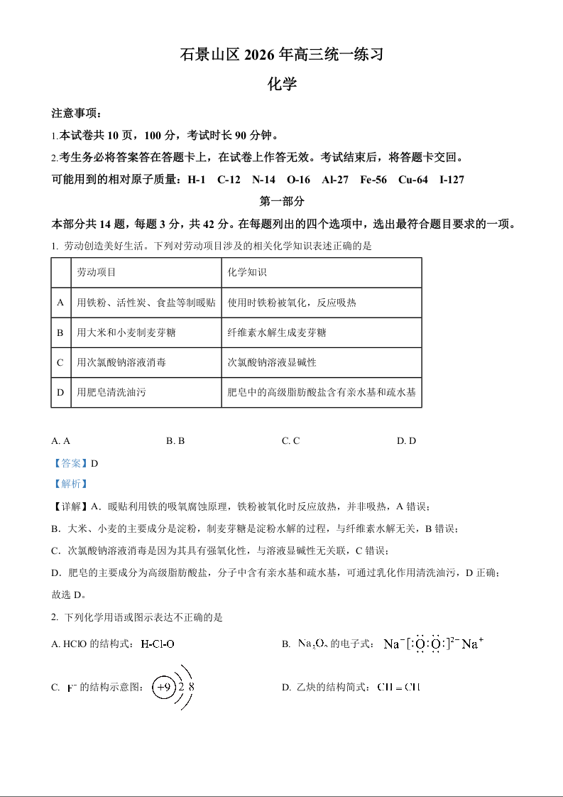 北京市石景山区2026年高三统一练习 化学答案.docx