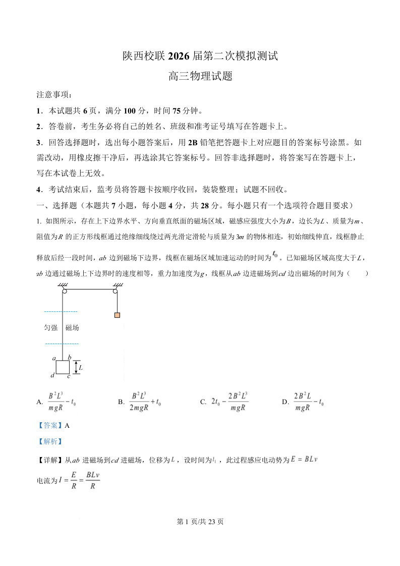 陕西省校联(西安市,渭南市,榆林市)2026届高三第二次模拟测试 物理答案.docx