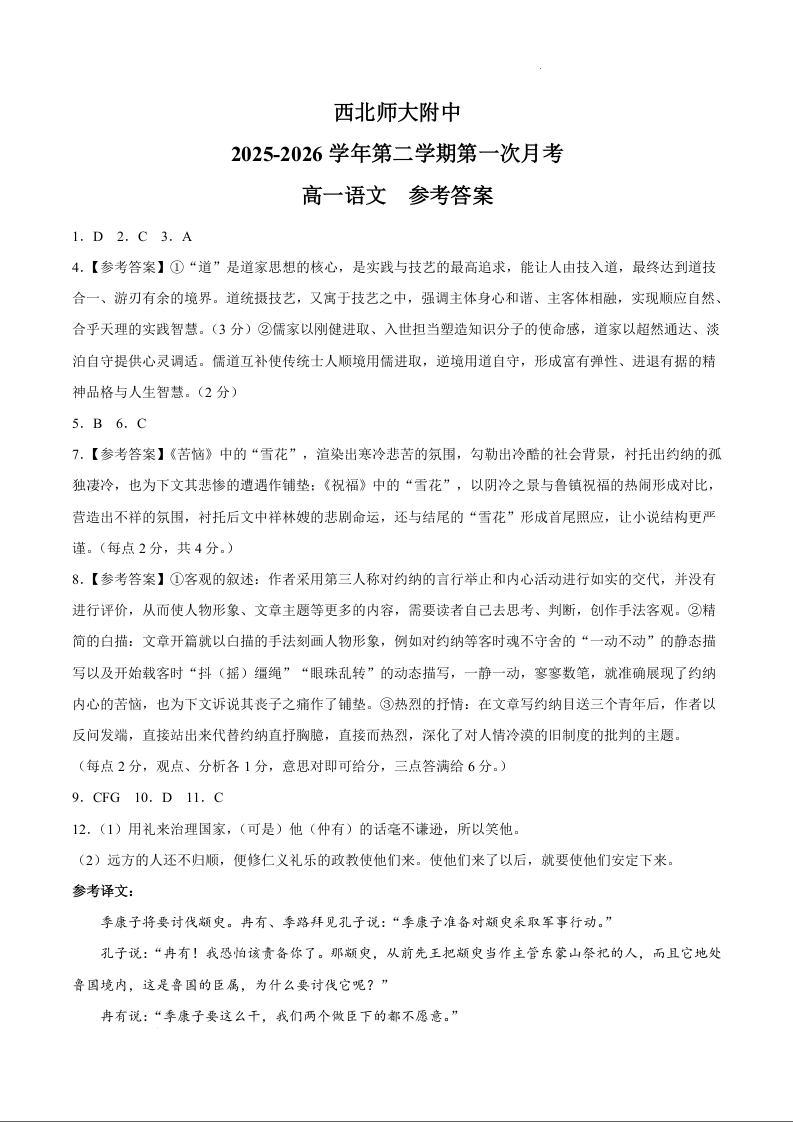 西北师范大学附属中学2025-2026学年高一下学期第一次月考 语文答案.docx