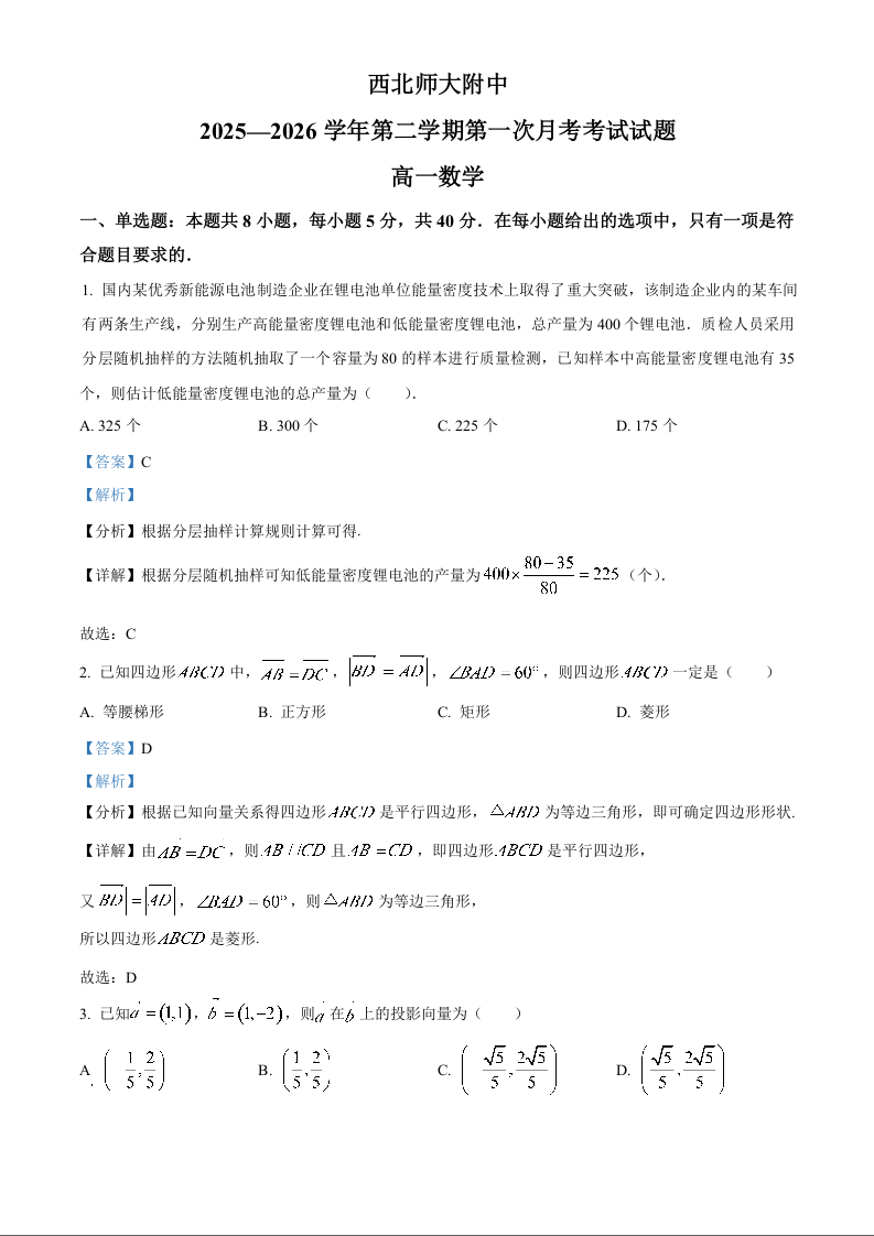 西北师范大学附属中学2025-2026学年高一下学期第一次月考 数学答案.docx