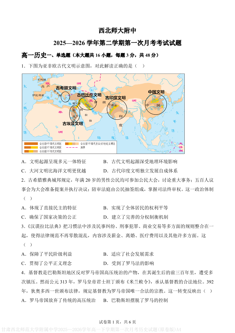 西北师范大学附属中学2025-2026学年高一下学期第一次月考 历史.pdf