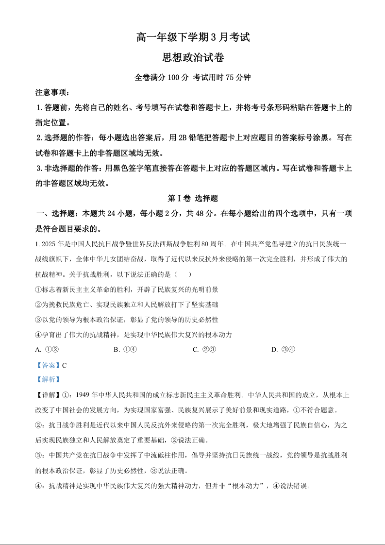 湖北十堰市郧阳中学2025-2026学年高一下学期3月月考 政治答案.docx