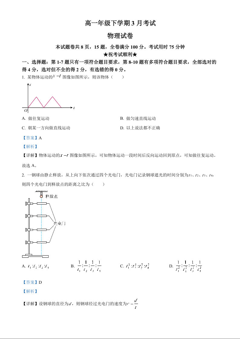 湖北十堰市郧阳中学2025-2026学年高一下学期3月月考 物理答案.docx