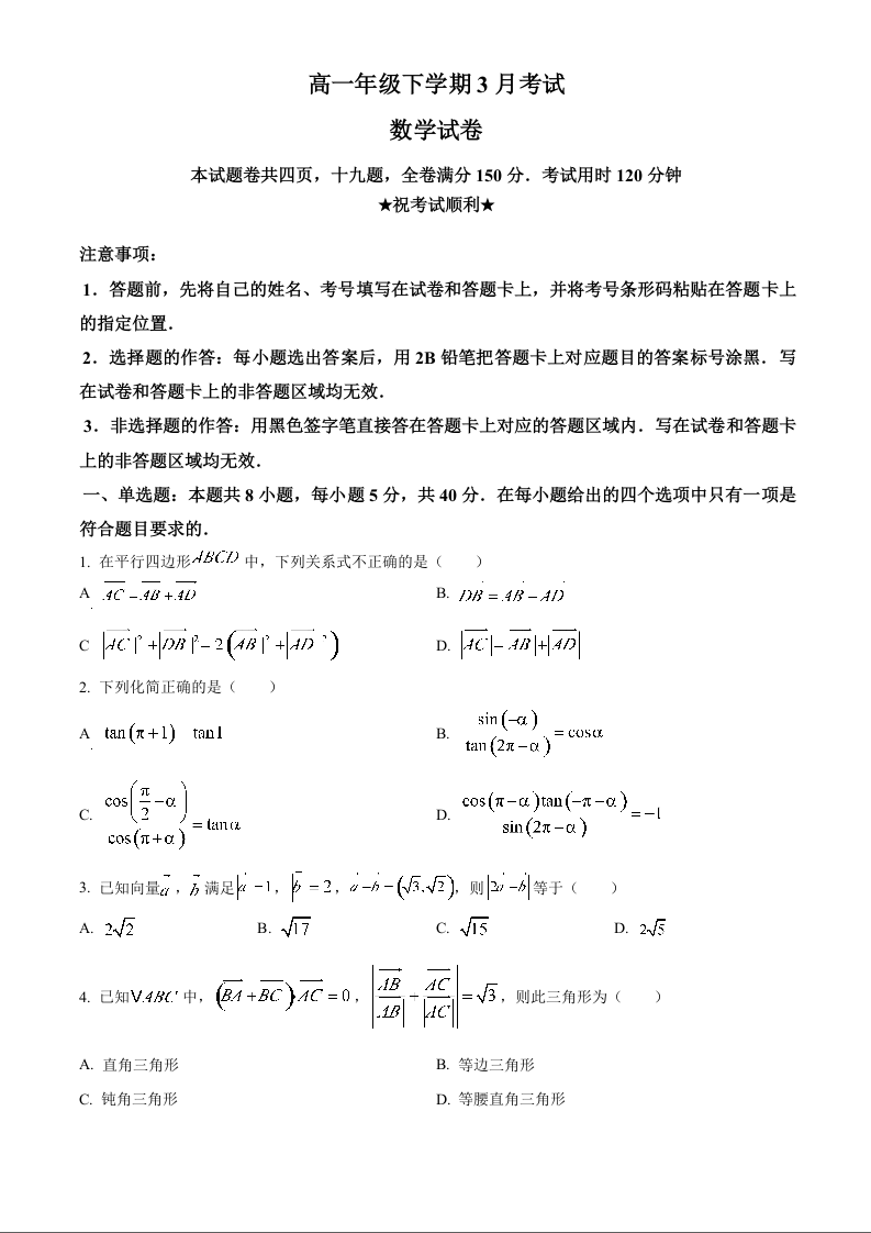 湖北十堰市郧阳中学2025-2026学年高一下学期3月月考 数学.docx