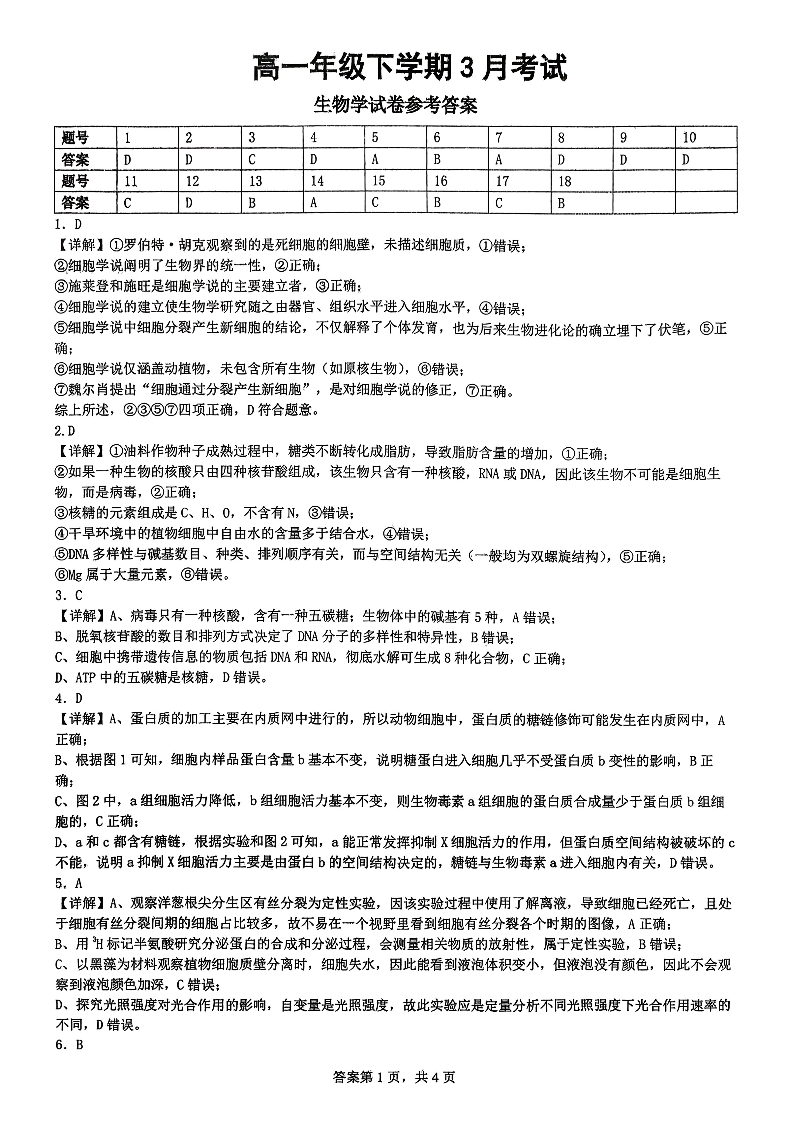 湖北十堰市郧阳中学2025-2026学年高一下学期3月月考 生物答案.pdf
