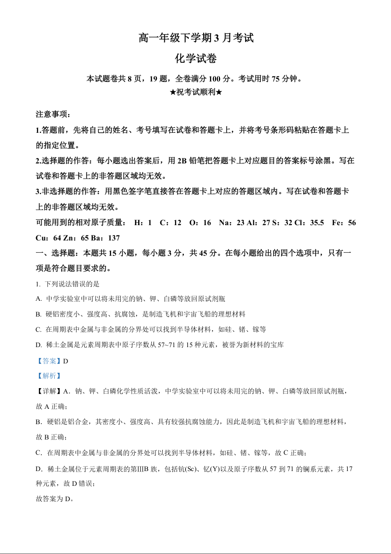 湖北十堰市郧阳中学2025-2026学年高一下学期3月月考 化学答案.docx