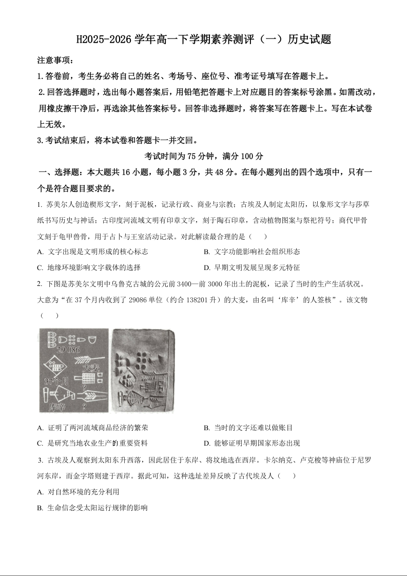 河南新乡市2025-2026学年高一下学期素养测评(一)历史.docx