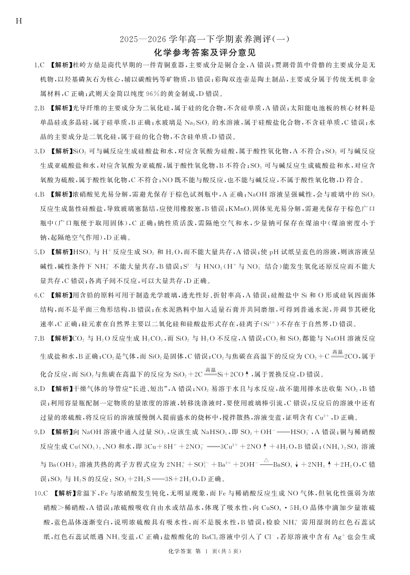 河南新乡市2025-2026学年高一下学期素养测评(一)化学答案.pdf