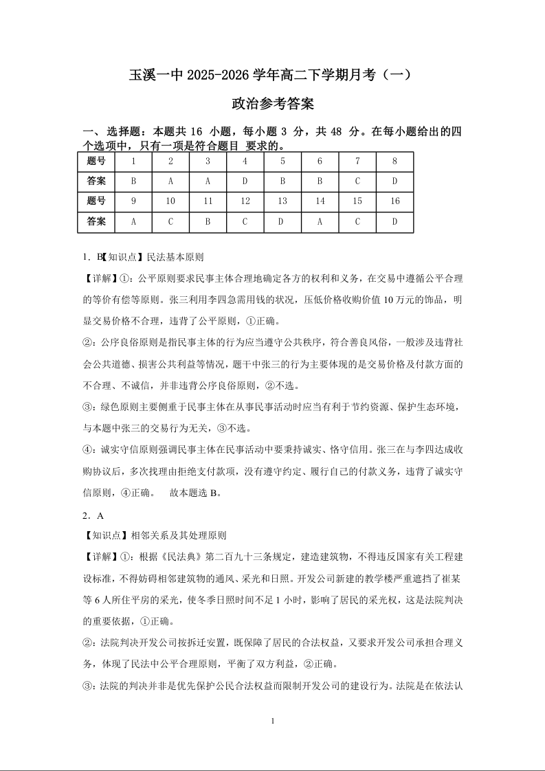 玉溪一中2025-2026学年下学期高二年级月考一 政治答案.docx