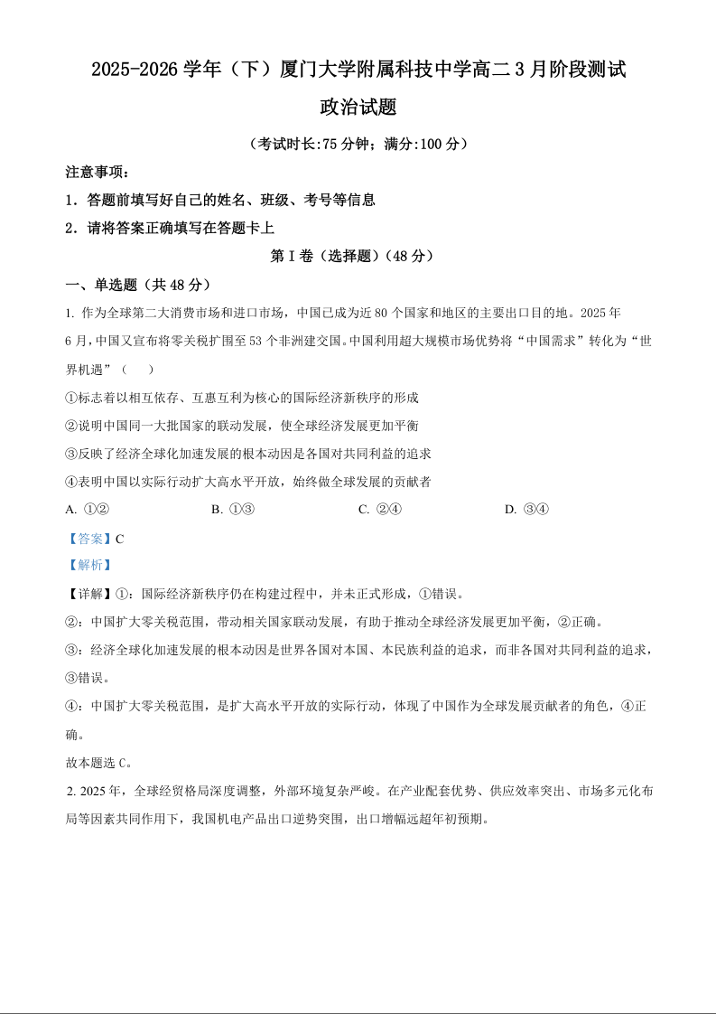 福建厦门大学附属科技中学2025-2026学年高二下学期3月阶段测试 政治答案.docx