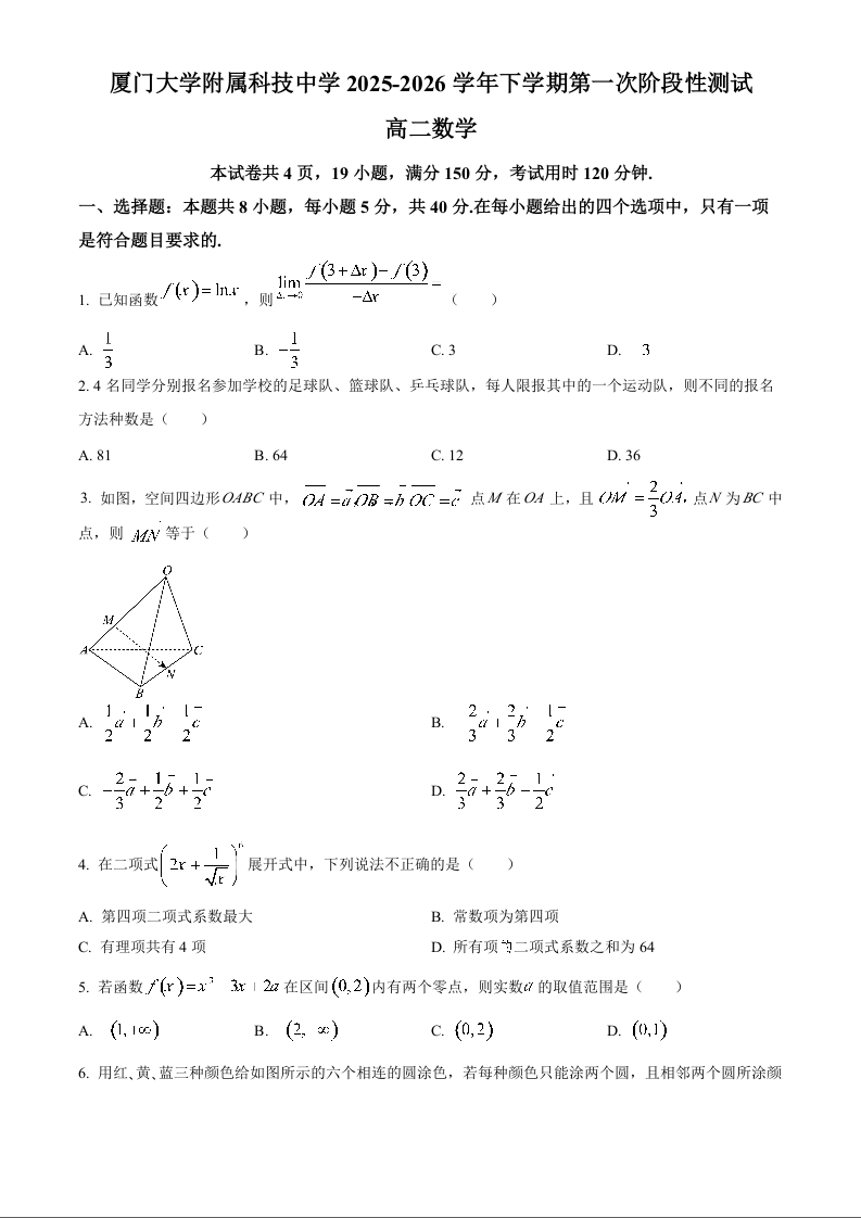 福建厦门大学附属科技中学2025-2026学年高二下学期3月阶段测试 数学.docx