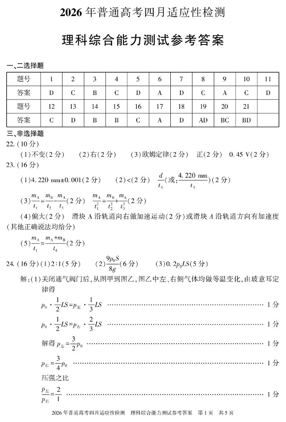 2026年普通高考四月适应性检测 理综答案.pdf