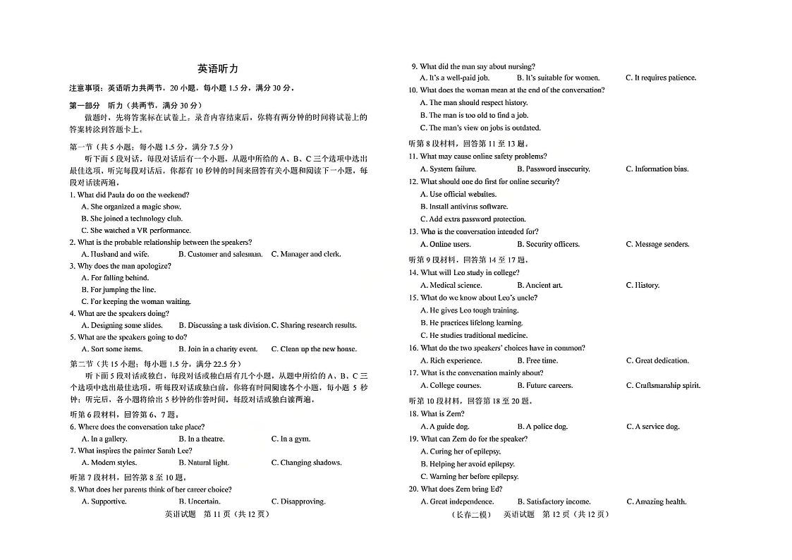 吉林省长春市2026届高三年级质量监测(二)英语听力试题.pdf